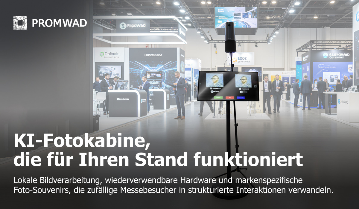 Projekt in Kürze: Die AI Photo Booth ist eine von Promwad entwickelte interne Hardware-Software-Lösung, die dazu dient, das Engagement und die Anzahl qualifizierter Besucher auf Messen und Branchenveranstaltungen zu steigern. Anstelle von statischen Displays mit Leiterplatten, Datenblättern und Hardware-Demos lädt sie Besucher zu einer kurzen interaktiven Sitzung ein und schickt sie mit einem personalisierten Foto mit Markenlogo nach Hause, wodurch es einfacher wird, mit Ingenieuren und dem Vertriebsteam ins Gespräch zu kommen. Die erste Version wurde auf den Messen Embedded World, ANGA COM und IBC 2025 eingesetzt, wo sie dazu beitrug, Besucher an den Stand zu locken und zu vielen konkreten Gesprächen über ihre Aufgaben und möglichen Projekte führte.