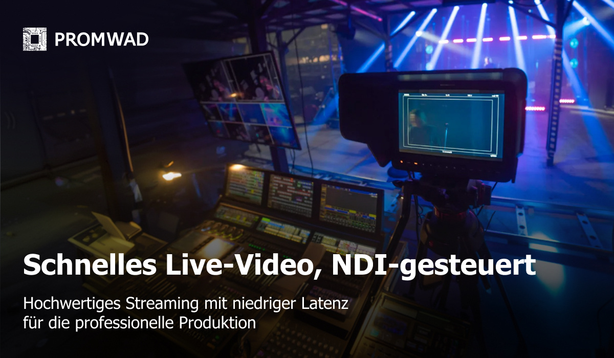 Um dieses Problem zu lösen, entwarf und entwickelte das Technikteam von Promwad eine Lösung, die auf der NDI-Technologie (Network Device Interface) basiert. NDI ist ein Standard für die Übertragung von Multimediadaten über IP-Netzwerke, der es den Geräten ermöglicht, sich automatisch zu finden, Bilder zu synchronisieren und Videos in hoher Qualität mit minimaler Latenz (bis zu 50 ms) zu übertragen.